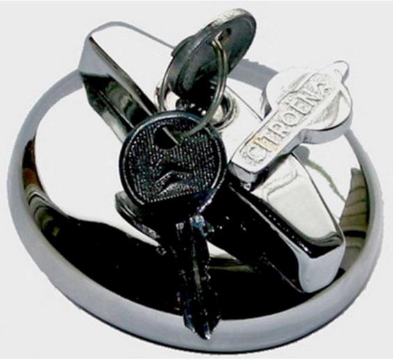 Tapon cromado con llave y logo para el deposito de gasolina, modelos anteriores a 1952 modelos con maletero de rueda Diam. 65mm